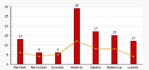 | Martedi | 13 | 13.27% | +13  | 6 | 12.77% | +6  | 6 | 12.77% | +6  |