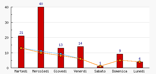 | Mercoledi | 40 | 39.22% | +19  | 11 | 22.45% | -2  | 10 | 21.28% | -3  |