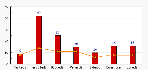 | Domenica | 16 | 12.03% | +6  | 8 | 12.12% | +2  | 8 | 12.12% | +2  |