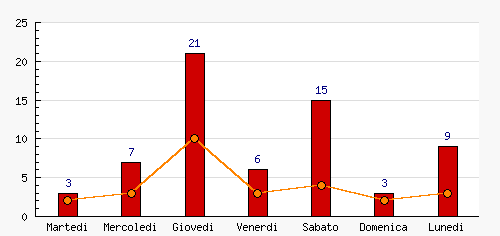 | Giovedi | 21 | 32.81% | +14  | 10 | 37.04% | +7  | 10 | 37.04% | +7  |