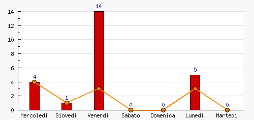 Venerdi | 14 | 58.33% | +13  | 3 | 27.27% | +2  | 3 | 27.27% | +2  |