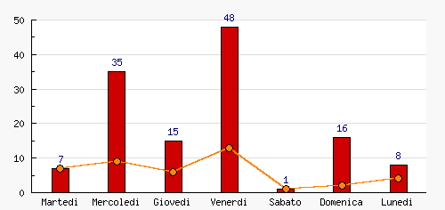 | Domenica | 16 | 12.31% | +15  | 2 | 4.76% | +1  | 2 | 4.76% | +1  |