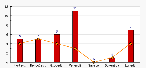Venerdi | 11 | 31.43% | +5  | 3 | 14.29% | -1  | 3 | 14.29% | -1  |